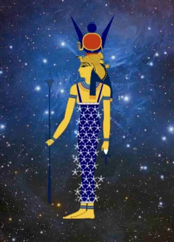 Nut, the sky goddess, bent over the earth, personifying the heavens. She was Geb's sister and wife, whom she had to couple with for the cosmic order. Every night, Nut swallowed the sun and gave birth to it every morning, hence becoming a symbol of life and death.